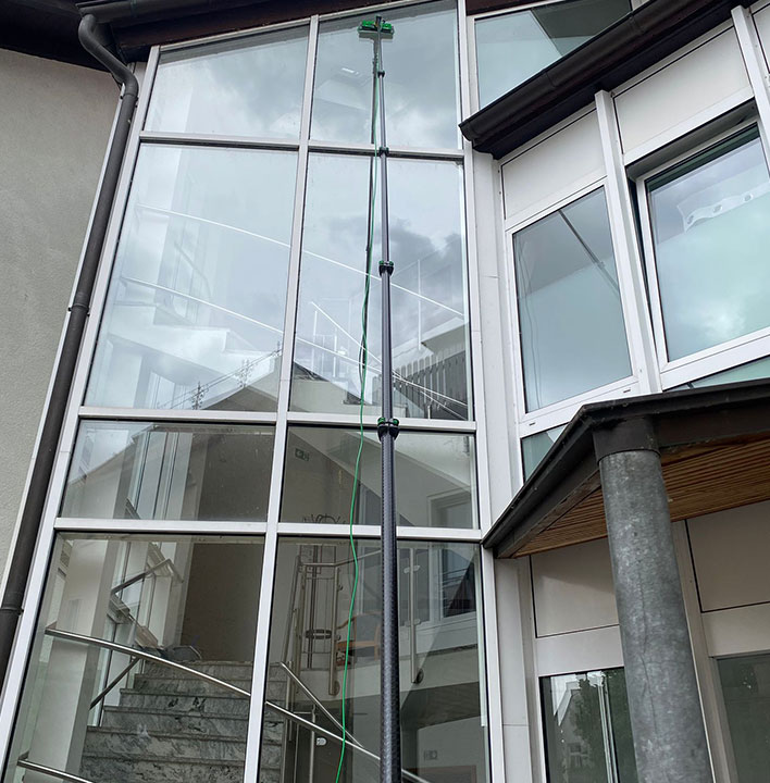 Für besonders große Glasflächen und schwer zugängliche Bereiche setzen wir auf moderne Osmose-Wassersysteme. Dieses Verfahren reinigt Glasflächen ausschließlich mit entmineralisiertem Wasser – ganz ohne chemische Zusätze – und ermöglicht streifenfreie Ergebnisse auch in großer Höhe.